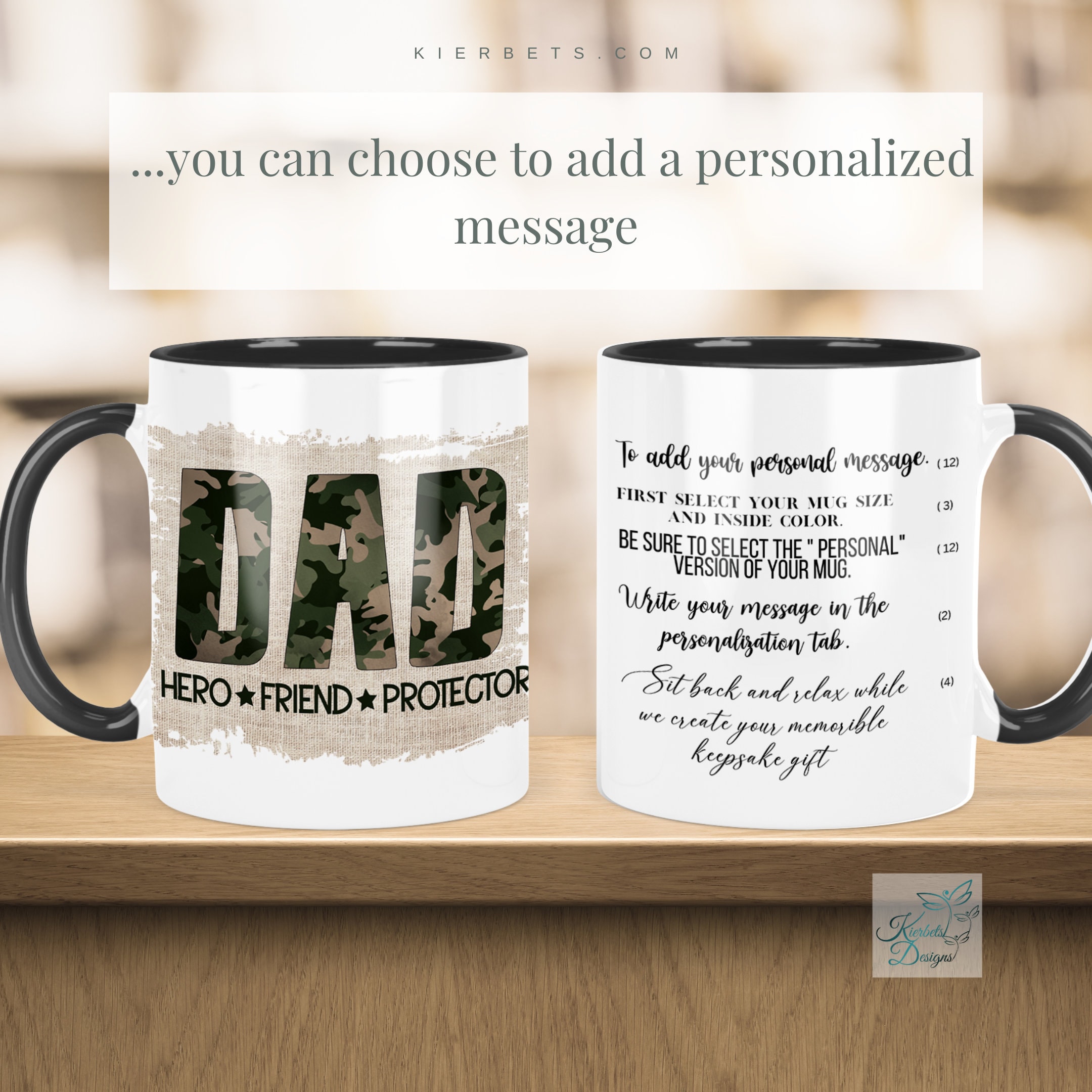 Weather your dad serves in the Military or is an avid hunter this mug is for him. Add a personal message on one side for a unique keepsake that Dad will enjoy for years. Mugs come in regular 11oz size and generous 15oz size. Completely dishwasher and microwave safe, these mugs are created with sublimation ink and are heat-pressed so design is permanent and will not crack peel or fade. Made to last for years! More on the dragonfly below.