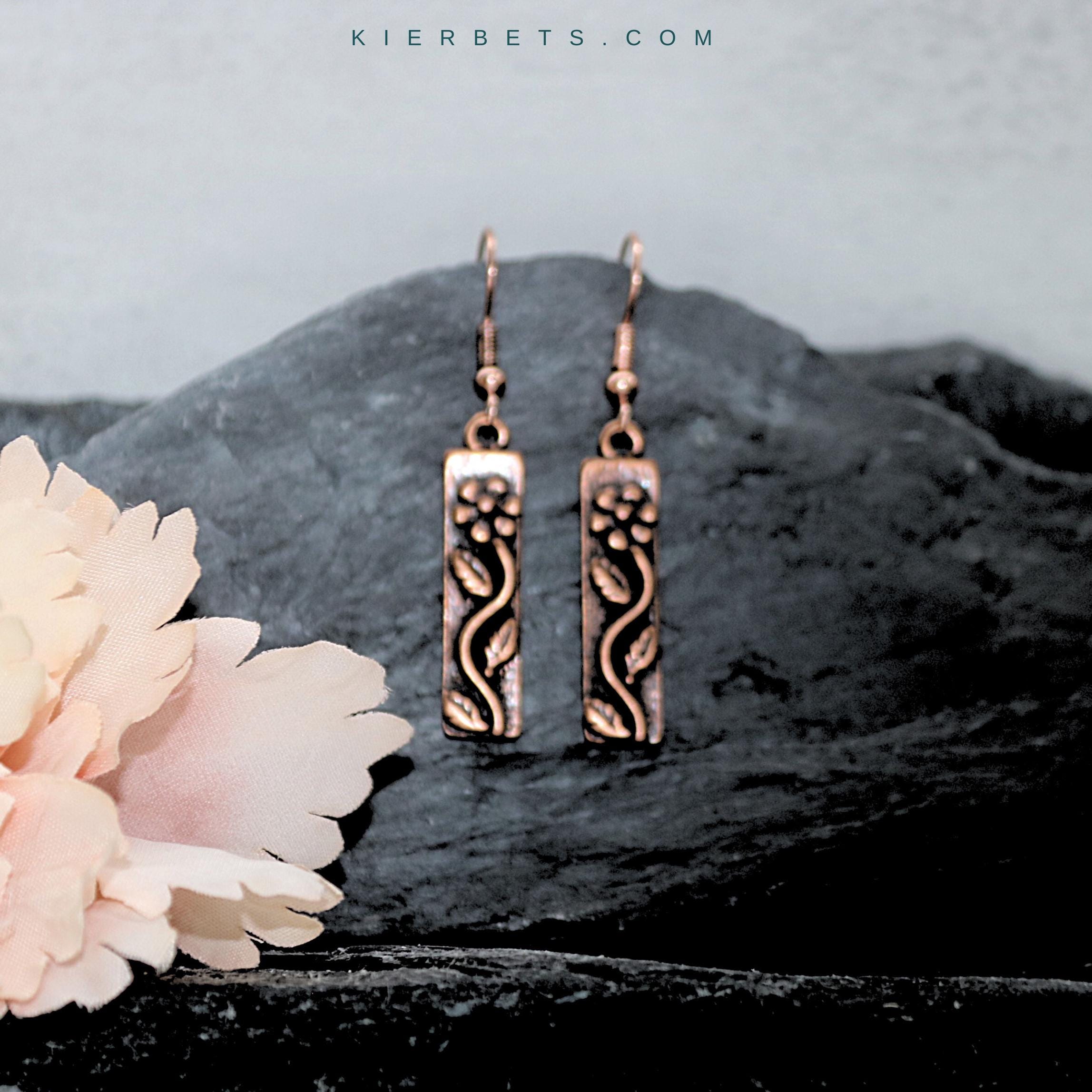 These cute trendy bar earrings come in your choice of antique silver, antique bronze or antique copper. The bars have adorable flower embelishments engraved on them, giving them depth and interest. Perfect for weekend wear and office wear.